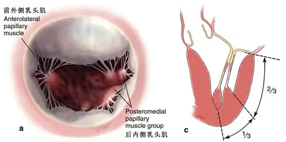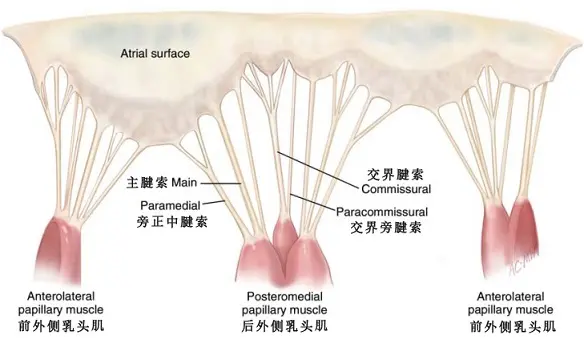瓣叶通过瓣下悬吊装置与左心室相连,一是保证瓣叶在舒张期开放,二是在舒张期防止瓣叶移位至瓣环以上水平。瓣下悬吊装置主要包括有收缩性的乳头肌和有弹性的腱索构成。