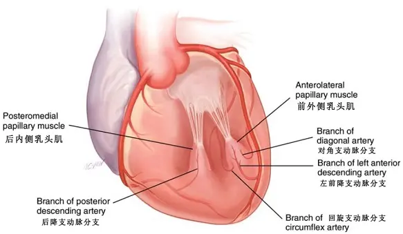 前外侧乳头肌由前降支、对角支或回旋支的边缘动脉形成的多个分支供血,后内侧乳头肌由回旋支或右冠动脉的小分支供血,因此后内侧乳头肌比前外侧乳头肌更容易坏死和丧失功能(Fig.8)。
