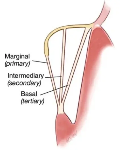 腱索根据链接到瓣膜的不同部位分为主要腱索、旁正中腱索、交界腱索(Fig.10)。