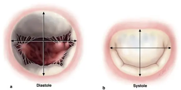 二尖瓣瓣环形状的变化贯穿于整个心动周期中,在舒张期,呈类圆形,在收缩期呈肾形,瓣环前后径显著小于横径(Fig.11);瓣环收缩是心室收缩的延续,是瓣膜口面积减少20-30%,增加瓣叶对合面,有利于二尖瓣的有效闭合,因此对于瓣环重塑成形手术是根据二尖瓣收缩期瓣环形态决定人工瓣环形态的。