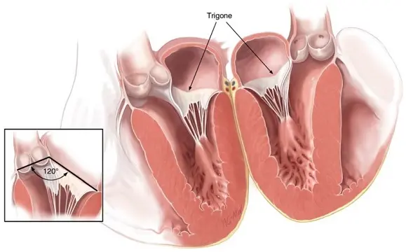 二尖瓣前叶基底部的两侧,分别被两个致密的纤维三角加固,即前外侧纤维三角和后内侧纤维三角。