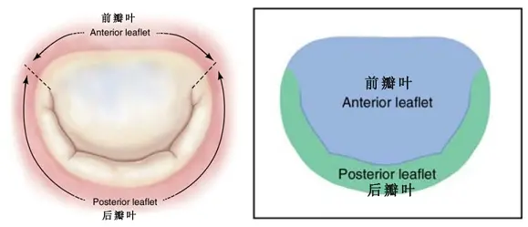 瓣叶是心脏瓣膜开合的重要装置,二尖瓣有前、后两个瓣叶,以及连接前后瓣叶的对合面称为交界瓣叶共同组成。前瓣叶基底部占据了二尖瓣周长的1/3,后瓣占据2/3周长;瓣叶表面积和瓣口面积的精确匹配是维持瓣膜理想功能的重要前提,前瓣约占瓣膜面积的75%,后瓣约占25%(Fig.1)。