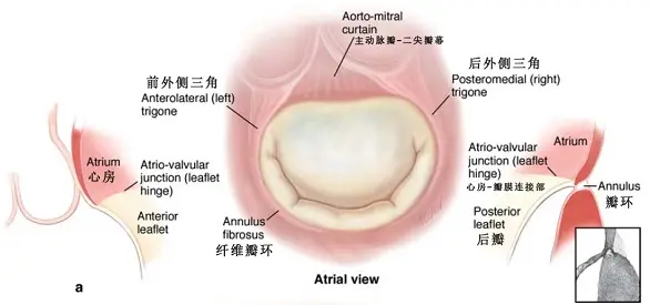 纤维瓣环是非连续性的结蹄组织带,由交错的环形和斜形的纤维束构成。瓣环实际只存在于后瓣叶附着处,其功能是既保证了心房、瓣叶及心室壁顶点的连续性,又为瓣叶的“铰链”提供了理想的活动度。瓣环在前瓣叶的附着处实际上并不存在,因为前瓣叶是主动脉瓣-二尖瓣幕(aorto-mitral curtain)的延续。主动脉瓣-二尖瓣幕从主动脉瓣环延伸至二尖瓣前叶基底部。