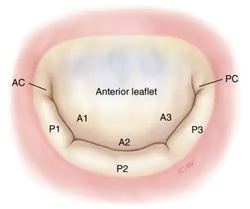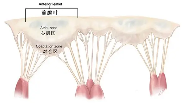 前瓣叶,位于主动脉瓣和左右两个纤维三角之间,呈半卵圆形,从基底部到边缘,分为两个区,即近端的心房区,远端的对合区;心房区光滑、菲薄、半透明,对合区增厚、粗糙,有相当数量的腱索附着(Fig.3);前瓣叶分为三部分,即前(A1区)、中(A2区)、后(A3区)部分(Fig.4)。