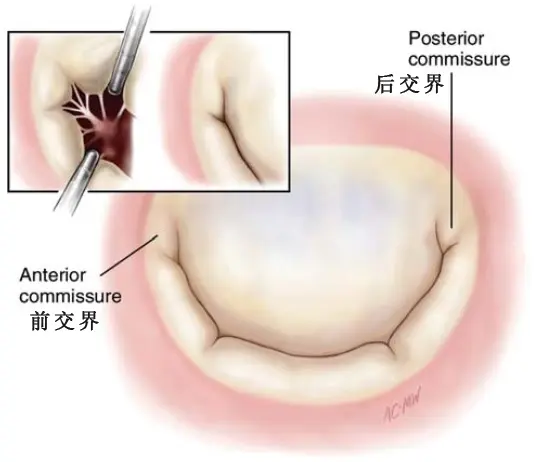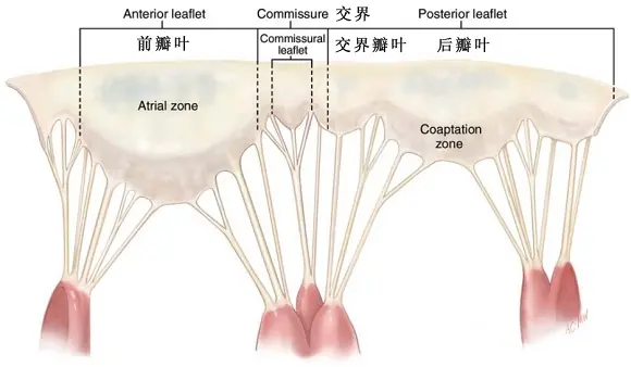 交界瓣叶,是前后瓣叶连续性的瓣叶交界处,形成一个Y形的结合线,是小三角形的瓣叶组织,基底部附着于瓣环,游离缘由一至两条特征性的扇形腱索附着(Fig.5)。交界是一个功能实体,能保持前后壁叶连续性,保证在相连处有效对合。